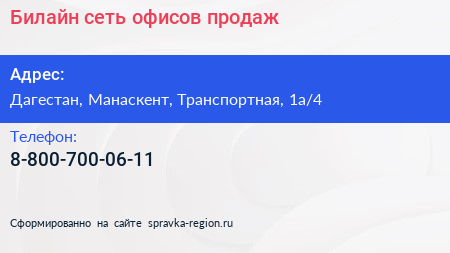Билайн, сеть офисов продаж по адресу Дагестан, Манаскент, Транспортная, 1а/4 в дальнейшем Организация, размещена в следующих категориях: