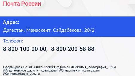 Почта России по адресу Дагестан, Манаскент, Сайдабекова, 20/2 в дальнейшем Организация, размещена в следующих категориях: