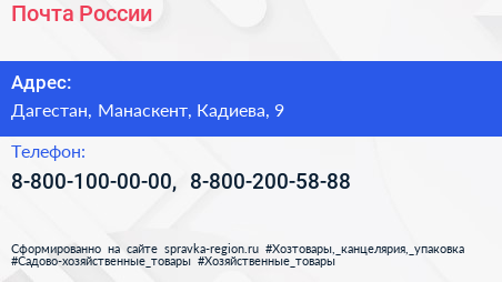 Почта России по адресу Дагестан, Манаскент, Кадиева, 9 в дальнейшем Организация, размещена в следующих категориях: