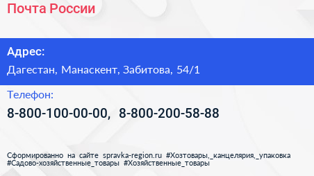 Почта России по адресу Дагестан, Манаскент, Забитова, 54/1 в дальнейшем Организация, размещена в следующих категориях: