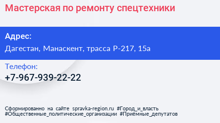 Мастерская по ремонту спецтехники по адресу Дагестан, Манаскент, трасса Р-217, 15а в дальнейшем Организация, размещена в следующих категориях: