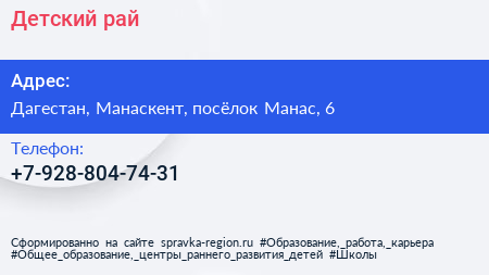 Детский рай по адресу Дагестан, Манаскент, посёлок Манас, 6 в дальнейшем Организация, размещена в следующих категориях: