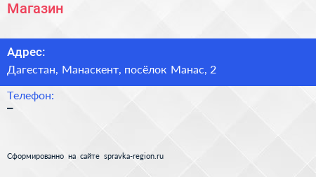 Магазин по адресу Дагестан, Манаскент, посёлок Манас, 2 в дальнейшем Организация, размещена в следующих категориях: