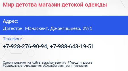 Мир детства, магазин детской одежды по адресу Дагестан, Манаскент, Джангишиева, 29/1 в дальнейшем Организация, размещена в следующих категориях: