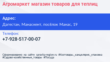 Агромаркет, магазин товаров для теплиц по адресу Дагестан, Манаскент, посёлок Манас, 19 в дальнейшем Организация, размещена в следующих категориях: