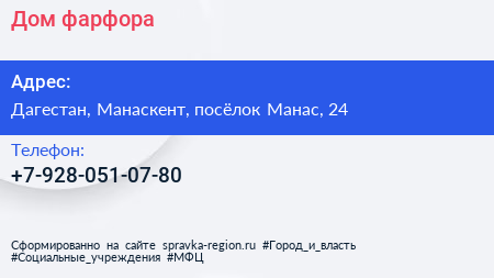 Дом фарфора по адресу Дагестан, Манаскент, посёлок Манас, 24 в дальнейшем Организация, размещена в следующих категориях: