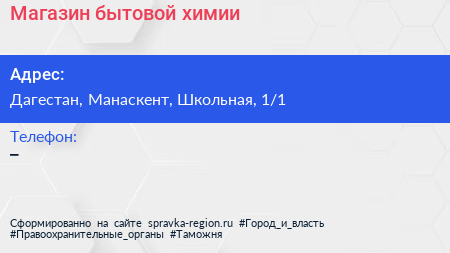Магазин бытовой химии по адресу Дагестан, Манаскент, Школьная, 1/1 в дальнейшем Организация, размещена в следующих категориях: