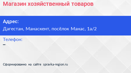 Магазин хозяйственный товаров по адресу Дагестан, Манаскент, посёлок Манас, 1а/2 в дальнейшем Организация, размещена в следующих категориях: