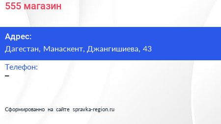 555, магазин по адресу Дагестан, Манаскент, Джангишиева, 43 в дальнейшем Организация, размещена в следующих категориях: