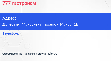 777, гастроном по адресу Дагестан, Манаскент, посёлок Манас, 1Б в дальнейшем Организация, размещена в следующих категориях: