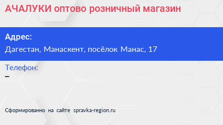 АЧАЛУКИ, оптово-розничный магазин по адресу Дагестан, Манаскент, посёлок Манас, 17 в дальнейшем Организация, размещена в следующих категориях: