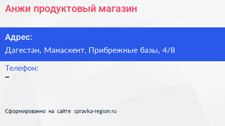 Анжи, продуктовый магазин по адресу Дагестан, Манаскент, Прибрежные базы, 4/8 в дальнейшем Организация, размещена в следующих категориях: