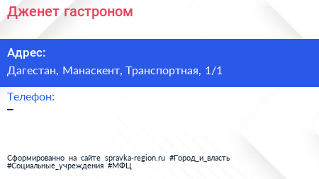 Дженет, гастроном по адресу Дагестан, Манаскент, Транспортная, 1/1 в дальнейшем Организация, размещена в следующих категориях: