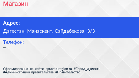 Магазин по адресу Дагестан, Манаскент, Сайдабекова, 3/3 в дальнейшем Организация, размещена в следующих категориях: