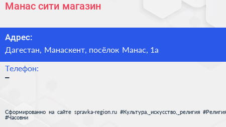 Манас сити, магазин по адресу Дагестан, Манаскент, посёлок Манас, 1а в дальнейшем Организация, размещена в следующих категориях: