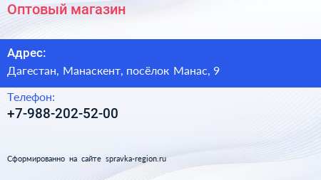 Оптовый магазин по адресу Дагестан, Манаскент, посёлок Манас, 9 в дальнейшем Организация, размещена в следующих категориях:
