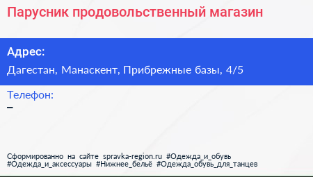 Парусник, продовольственный магазин по адресу Дагестан, Манаскент, Прибрежные базы, 4/5 в дальнейшем Организация, размещена в следующих категориях: