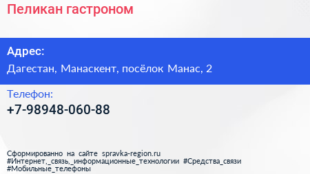 Пеликан, гастроном по адресу Дагестан, Манаскент, посёлок Манас, 2 в дальнейшем Организация, размещена в следующих категориях: