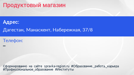 Продуктовый магазин по адресу Дагестан, Манаскент, Набережная, 37/8 в дальнейшем Организация, размещена в следующих категориях: