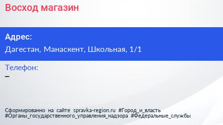 Восход, магазин по адресу Дагестан, Манаскент, Школьная, 1/1 в дальнейшем Организация, размещена в следующих категориях:
