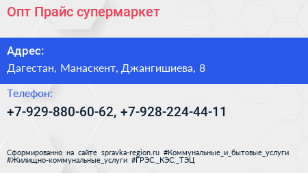 Опт Прайс, супермаркет по адресу Дагестан, Манаскент, Джангишиева, 8 в дальнейшем Организация, размещена в следующих категориях: