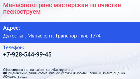 Манасавтотранс, мастерская по очистке пескоструем по адресу Дагестан, Манаскент, Транспортная, 17/4 в дальнейшем Организация, размещена в следующих категориях: