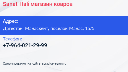 Sanat Hali, магазин ковров по адресу Дагестан, Манаскент, посёлок Манас, 1а/5 в дальнейшем Организация, размещена в следующих категориях:
