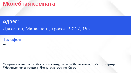 Молебная комната по адресу Дагестан, Манаскент, трасса Р-217, 15в в дальнейшем Организация, размещена в следующих категориях:
