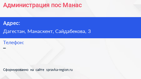 Администрация пос. Манас по адресу Дагестан, Манаскент, Сайдабекова, 3 в дальнейшем Организация, размещена в следующих категориях: