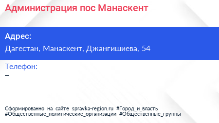 Администрация пос. Манаскент по адресу Дагестан, Манаскент, Джангишиева, 54 в дальнейшем Организация, размещена в следующих категориях: