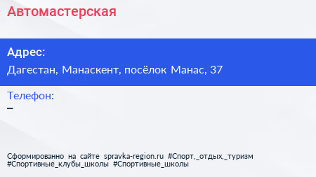Автомастерская по адресу Дагестан, Манаскент, посёлок Манас, 37 в дальнейшем Организация, размещена в следующих категориях: