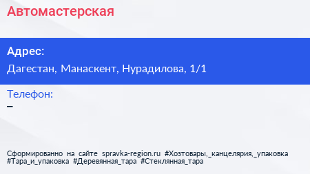 Автомастерская по адресу Дагестан, Манаскент, Нурадилова, 1/1 в дальнейшем Организация, размещена в следующих категориях: