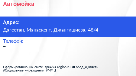 Автомойка по адресу Дагестан, Манаскент, Джангишиева, 48/4 в дальнейшем Организация, размещена в следующих категориях: