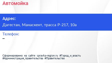 Автомойка по адресу Дагестан, Манаскент, трасса Р-217, 10а в дальнейшем Организация, размещена в следующих категориях: