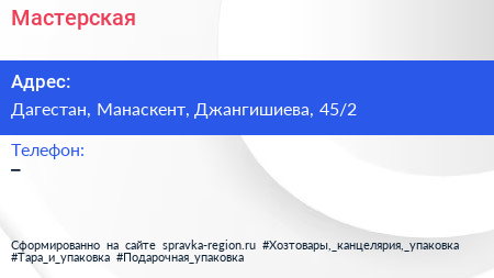Мастерская по адресу Дагестан, Манаскент, Джангишиева, 45/2 в дальнейшем Организация, размещена в следующих категориях: