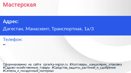 Мастерская по адресу Дагестан, Манаскент, Транспортная, 1а/3 в дальнейшем Организация, размещена в следующих категориях:
