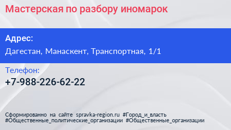 Мастерская по разбору иномарок по адресу Дагестан, Манаскент, Транспортная, 1/1 в дальнейшем Организация, размещена в следующих категориях: