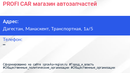 PROFI-CAR, магазин автозапчастей по адресу Дагестан, Манаскент, Транспортная, 1а/5 в дальнейшем Организация, размещена в следующих категориях:
