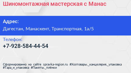 Шиномонтажная мастерская, с. Манас по адресу Дагестан, Манаскент, Транспортная, 1а/5 в дальнейшем Организация, размещена в следующих категориях: