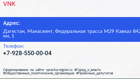 VNK по адресу Дагестан, Манаскент, Федеральная трасса М29 Кавказ 842 км, 1 в дальнейшем Организация, размещена в следующих категориях: