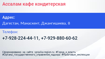 Ассалам, кафе-кондитерская по адресу Дагестан, Манаскент, Джангишиева, 8 в дальнейшем Организация, размещена в следующих категориях: