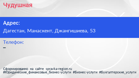 Чудушная по адресу Дагестан, Манаскент, Джангишиева, 53 в дальнейшем Организация, размещена в следующих категориях: