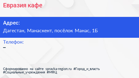 Евразия, кафе по адресу Дагестан, Манаскент, посёлок Манас, 1Б в дальнейшем Организация, размещена в следующих категориях: