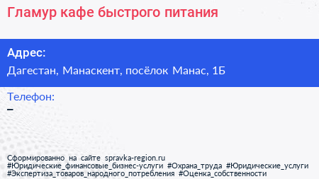 Гламур, кафе быстрого питания по адресу Дагестан, Манаскент, посёлок Манас, 1Б в дальнейшем Организация, размещена в следующих категориях: