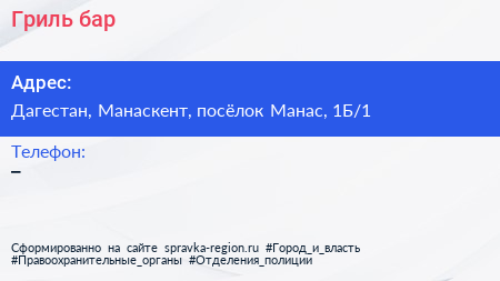Гриль-бар по адресу Дагестан, Манаскент, посёлок Манас, 1Б/1 в дальнейшем Организация, размещена в следующих категориях: