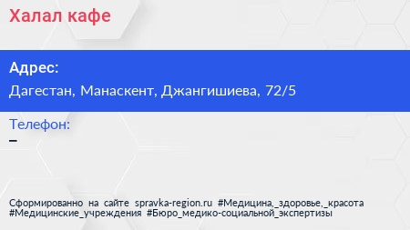 Халал, кафе по адресу Дагестан, Манаскент, Джангишиева, 72/5 в дальнейшем Организация, размещена в следующих категориях: