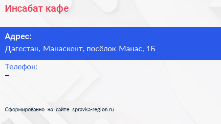 Инсабат, кафе по адресу Дагестан, Манаскент, посёлок Манас, 1Б в дальнейшем Организация, размещена в следующих категориях: