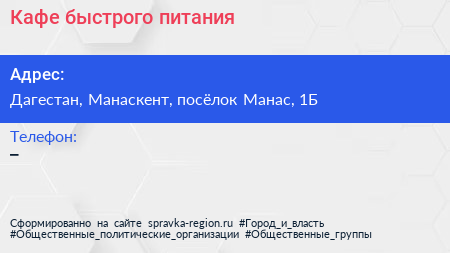 Кафе быстрого питания по адресу Дагестан, Манаскент, посёлок Манас, 1Б в дальнейшем Организация, размещена в следующих категориях: