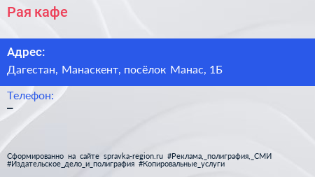 Рая, кафе по адресу Дагестан, Манаскент, посёлок Манас, 1Б в дальнейшем Организация, размещена в следующих категориях: