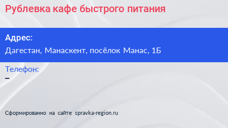 Рублевка, кафе быстрого питания по адресу Дагестан, Манаскент, посёлок Манас, 1Б в дальнейшем Организация, размещена в следующих категориях: